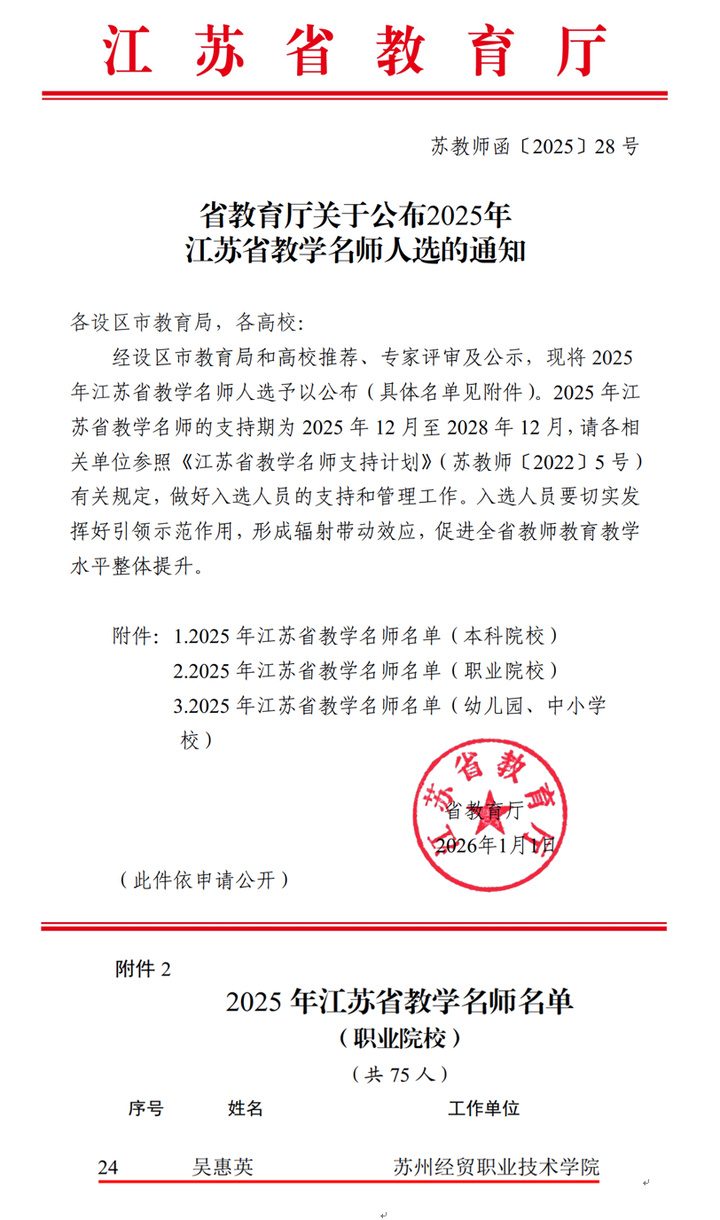 近日,江苏省教育厅公布2025年江苏省教学名师人选名单,苏州经贸职业技术学院吴惠英教授成功入选。