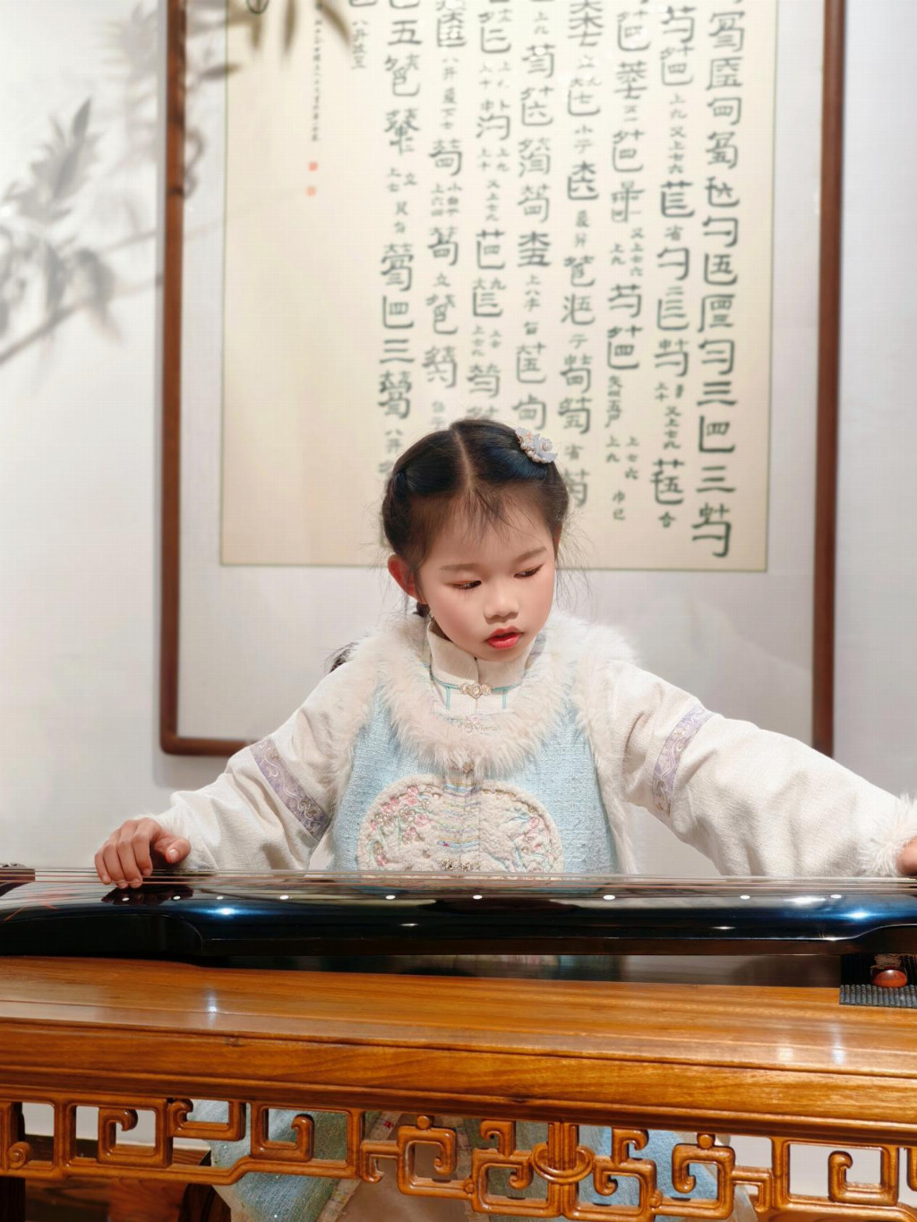 六岁那年,她便正式开启了古琴修习之路,师从怀化学院陈丽霞教授,在严谨而细致的教导下,从基础指法到乐曲意境,逐步踏入这片清微澹远的艺术天地。她已陆续学习了《秋风词》、《将进酒》、《酒狂》、《良宵引》等多首经典曲目,在丝弦的吟猱间,感受着跨越千年的情感与哲思。