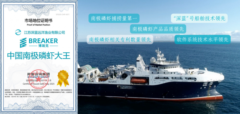 在南极磷虾高值化生产端,深蓝BREAKER®南极磷虾油工厂顺利通过GMP、HACCP、FSSC22000等品质认证,是全球首家从海上捕捞到陆上精深加工全产业链获得此认证的企业。