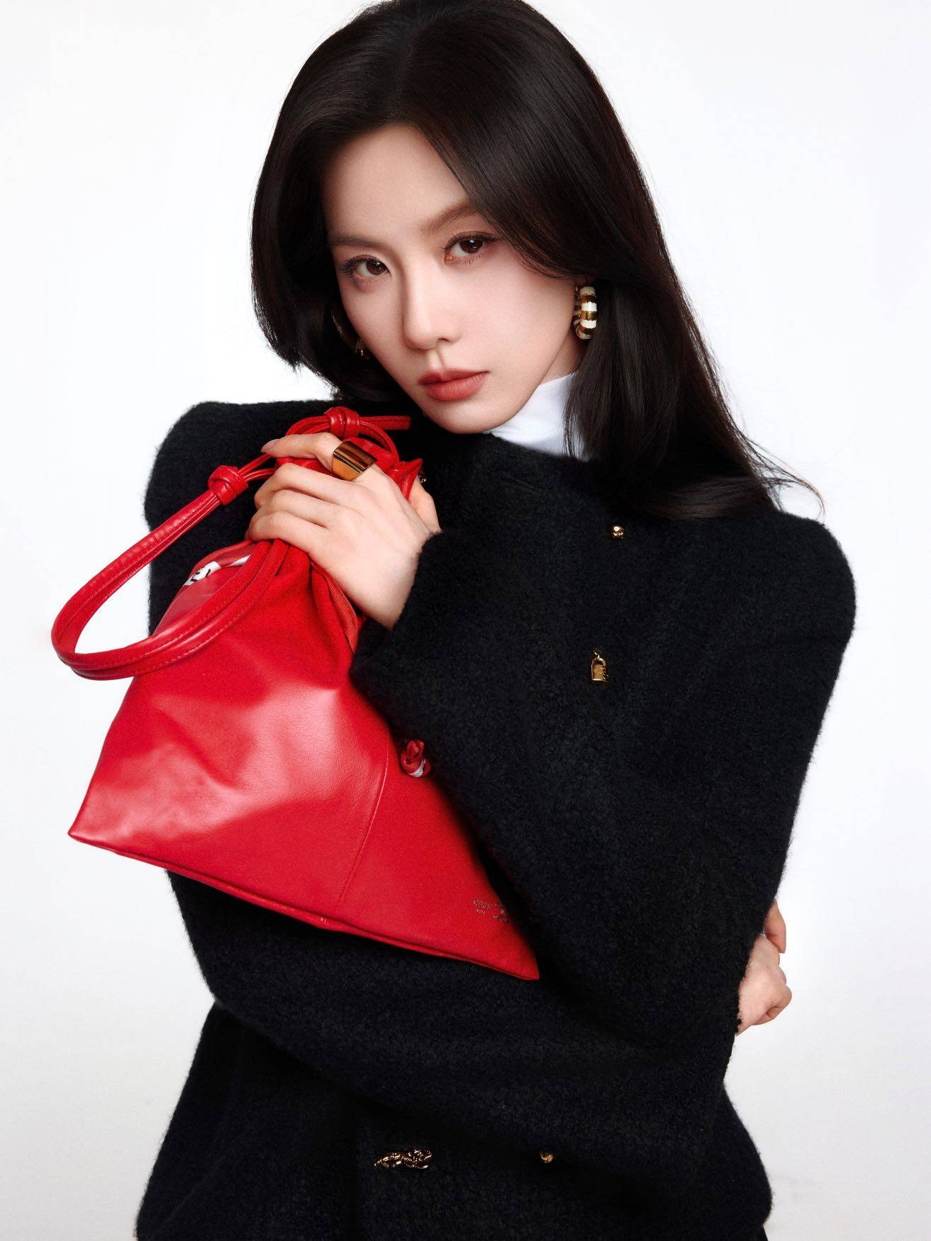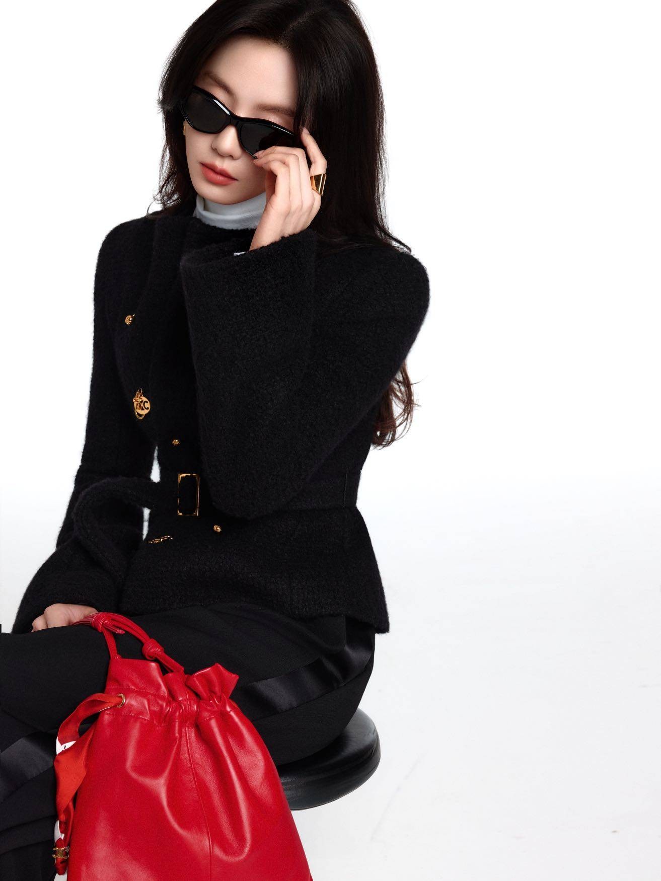 点睛之笔莫过于手中那只红色的Crystal Pouch手袋。黑与红的冷暖碰撞,打破了全黑穿搭的沉闷,让整体造型瞬间鲜活起来。她站在夜色里,没有多余的装饰,却凭借优越的体态和清冷优雅的气质,把“行走的衣架”这个称号稳稳焊在身上。