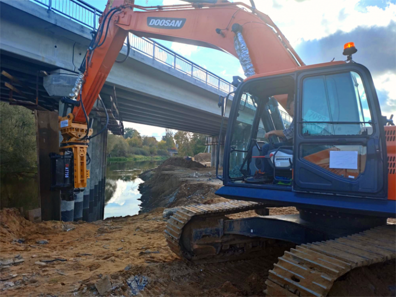 技术价值在市场中彰显。绍兴某桥梁下拔桩工程,现场限高仅3.5米,需处理3米长钢板桩,传统设备因机身高度与操作半径受限陷入施工困境。安腾侧夹式挖机锤凭借紧凑结构与灵活操控性能,依托360°回转及侧倾功能,无需辅助设备即可从侧面精准夹持钢板桩,在低矮空间内高效完成拔桩作业。