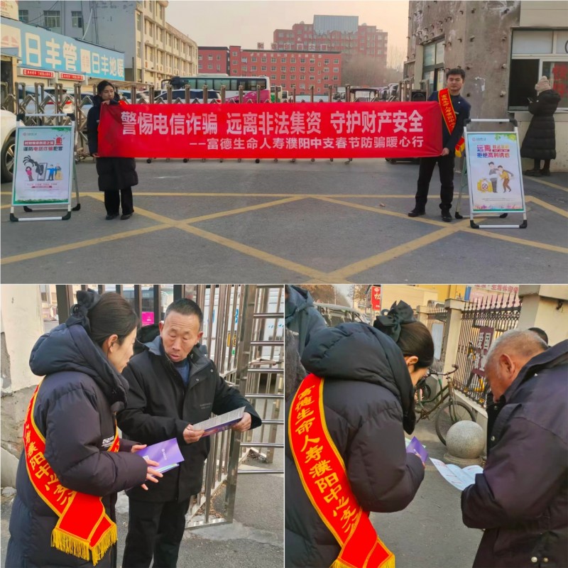 岁末年初,春运大幕启帷,人员流动与资金周转进入高峰期,电信诈骗、非法集资等非法金融活动也随之进入高发阶段。为切实守护群众“钱袋子”,践行金融企业社会责任,1月16日起,富德生命人寿河南分公司统筹下辖多家机构同步行动,以“警惕电信诈骗 远离非法集资 守护财产安全”为统一主题,多点开花开展“春节防骗暖心行”系列专项宣传活动,其中濮阳中支、新乡中支分别走进濮阳市长途汽车站、新乡市高铁东站,将金融安全知识与平安祝福一同送达返乡群众手中,全省联动为新春佳节筑牢金融安全防护屏障。