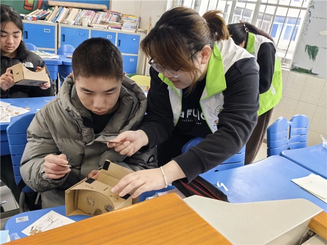 图为志愿者帮助制作同学制作VR眼镜。陈昕雨 供图
