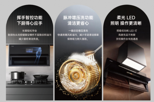 此外,挥手智控、脉冲增压清洗等功能的加入,进一步提升了烹饪的便捷性 —— 无需触碰面板即可调节风量,高压脉冲水流则能深度清洁油网,让烟机长期保持高效运行。