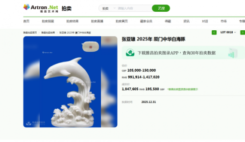 2025年第十八期英国罗素拍卖公司举办的中国书画专场拍卖会在12月31号如期举行,此次备受关注的雕刻艺术家张亚雄作品《厦门中华白海豚》经多轮激烈竞逐,最终以195,580英镑,合计人民币1,847,605元落槌成交,远超此前105,000-150,000英镑的估值区间,从各项标准来看,能上雅昌拍卖艺术榜的艺术家,均是得到过市场检验过的艺术家,要具备较高的资历,艺术作品和艺术地位得到业界的广泛认可,在艺术市场起到带动引领的作用。