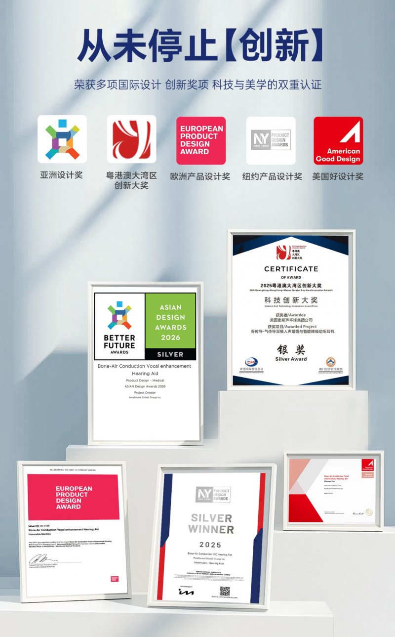 在技术创新与产品实力的双重驱动下,麦斯声MaxSound在全球市场中表现亮眼,斩获多项国际权威大奖,成为行业内公认的技术领先者。品牌凭借卓越的技术实力与产品表现,一举荣获美国好设计奖、纽约产品设计奖、欧洲产品设计奖、亚洲产品设计奖等多项听力健康领域的顶级荣誉,这些奖项不仅是对麦斯声MaxSound产品设计与性能的高度认可,更是证明了品牌在全球听力健康领域领先地位。每一项奖项的背后,都是麦斯声MaxSound对声学技术的不懈探索,对用户聆听体验的极致追求,也是Better Sound Better Life品牌初心的生动诠释。
