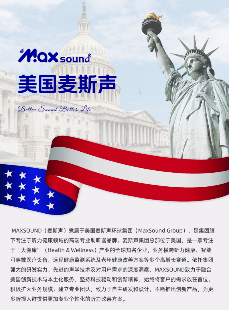 在全球大健康产业蓬勃发展的浪潮中,听力健康作为关乎生活质量的重要领域,正受到越来越多的关注。而麦斯声MaxSound,这个源自美国的高端专业助听器品牌,凭借深厚的品牌底蕴、卓越的技术实力与严苛的品质标准,成为了听力解决方案领域的佼佼者,始终践行着Better Sound Better Life的品牌信仰,为全球听损人群点亮清晰聆听的希望。