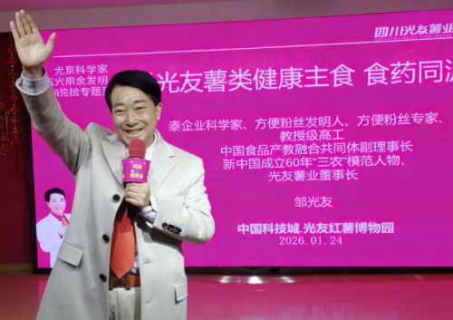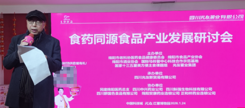 1月26日:为深入推进食药同源食品产业创新升级,激活地方特色资源价值,服务区域经济社会高质量发展,2026年1月24日,食药同源食品发展研讨会在中国科技城光友红薯博物园成功召开。本次会议由绵阳市老科协医药食品健康委员会、绵阳市食品产业协会、绵阳市酒业协会、国际马铃薯中心科技合作示范基地、国家十三五薯类方便主食课题组、光友薯业集团主办,四川光友新贸易有限公司承办,民建绵阳医药总支、四川中兴药业公司、四川斛强生物科技有限公司、四川醉国色食品有限公司、绵阳安康药业连锁公司、正和祥药业连锁公司协办。