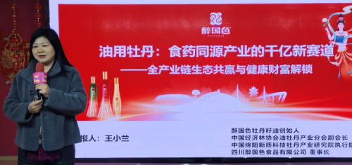醉国色牡丹籽油创始人、四川醉国色食品有限公司董事长王小兰围绕《油用牡丹:食药同源产业的千亿新赛道》展开分享,深度解析油用牡丹的产业价值与发展潜力。她指出,油用牡丹兼具高产出、高含油率、高品质的核心优势,不仅是优质的油料作物,更在药用、保健等领域拥有广阔应用空间。当前,国内油用牡丹种植规模已达2.7万公顷,形成多个规模化种植园区,产业链不断延伸至深加工、文旅融合等领域。王小兰表示,四川醉国品将以牡丹籽油为核心,依托新质科技牡丹产业发展研究院的技术支撑,推动油用牡丹在食品、美妆、医药等领域的多元应用,助力这一特色产业突破千亿市场规模,打造食药同源新增长极。