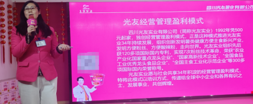 光友薯业集团管理发展总监杨艳华发布《光友经营管理盈利模式》,并详细介绍光友薯业的发展优势。她提到:“ 四川光友实业有限公司(简称光友实业)1992年凭500元起家,独创经营管理盈利模式,34年持续发展,在薯类健康方便主食产业深耕,发明方便粉丝、方便酸辣粉等产品,实现7次粉丝技术革命,斩获120多项国际国内专利,荣获“农业产业化国家重点龙头企业”等300多项荣誉 。活动现场,光友实业愿开放共享这一模式,以培训为桥梁,助力更多企业突破发展瓶颈,携手共创商业新辉煌,为食品工业及中小企业发展注入光友智慧与力量。”