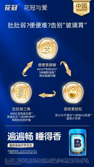 围绕宝宝娇嫩的肠道环境,花冠与爱在配方中引入“益生菌+益生元+HMO”的“铁三角”组合,为转奶构筑第二道支撑。其中,400亿益生菌【8】为肠道注入有益力量,双益生元【9】作为益生菌的持续“养分”,进一步促进肠道活力,同时 6 种 HMO【10】,则能帮助有益菌更好地增殖。三者互相配合,共同巩固肠道微生态,不仅改善便便状态,也增强了肠道稳定性。