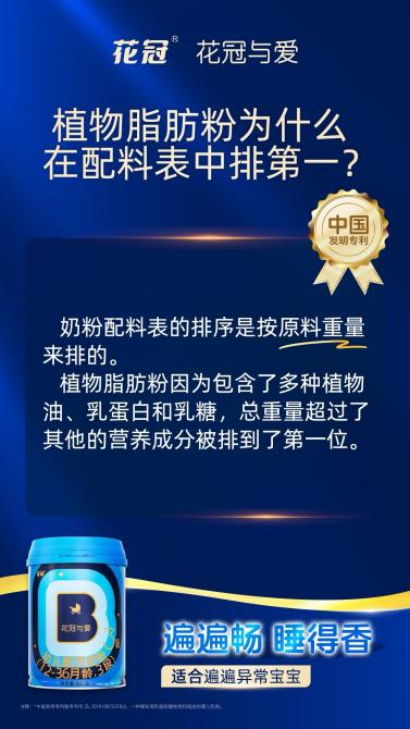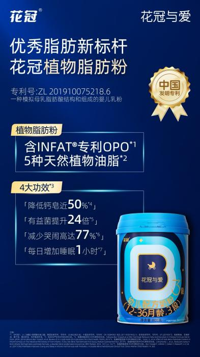 其中,这款奶粉采用的花冠第六代植物脂肪粉,是花冠26年深耕母乳脂肪研究的成果,使得奶粉中的脂肪更匹配宝宝的消化路径。一方面,加入的瑞典INFAT®专利OPO【1】【2】,结构上更贴近母乳脂肪,有助于减少钙皂生成,软化便便【3】,提升肠道有益菌活性【4】;另一方面,从50多种天然植物中精选出的椰子油、亚麻籽油等5种植物油【5】,通过科学配比形成优质油脂,既补充了宝宝发育所需的多种脂肪酸,也提升了脂肪的吸收效率。