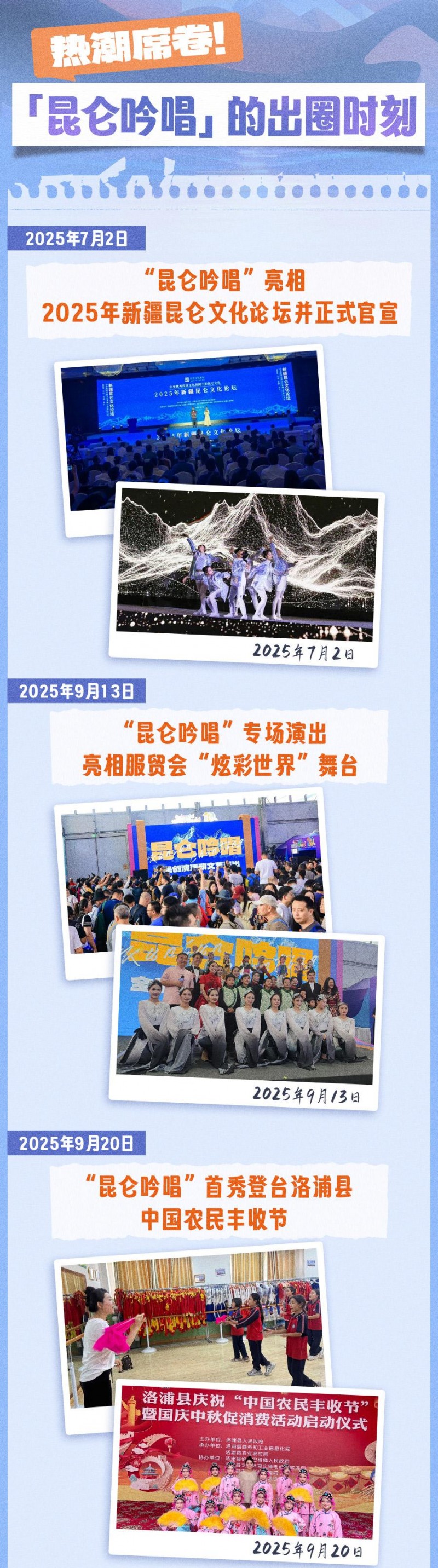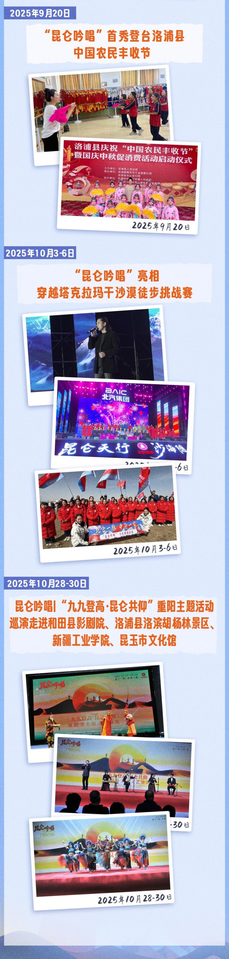 值得一提的是,“昆仑吟唱”的系列落地活动密集开展,也在持续点燃公众参与热情。如2025年服贸会“炫彩世界”舞台进行专场演出,向世界展示昆仑文化的魅力;在洛浦县中国农民丰收节上首秀,让文化艺术扎根基层、服务人民;结合穿越塔克拉玛干沙漠徒步挑战赛,实现了昆仑文化与挑战极限的跨界尝试;“九九登高·昆仑共仰”重演主题活动巡演走进和田县影剧院、洛浦县洛滨胡杨林景区、新疆工业学院、昆玉市文化馆……这一系列组合拳,使得“昆仑吟唱”持续占据文化热点,从一场赛事升维为一场贯穿时间长、覆盖范围广、融入场景多的文化盛事。