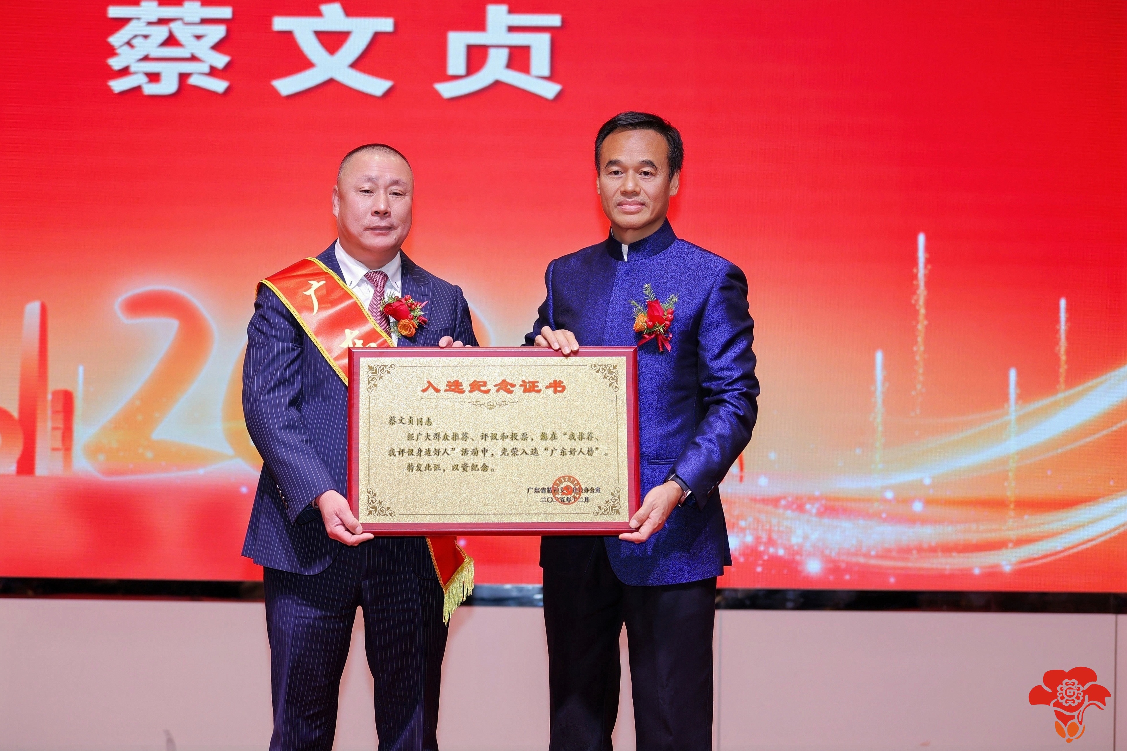 商会蔡文贞主席一直来将“慈善为怀、达济天下”的信念融入日常,他带领企业、商会和公益会在万企兴万村、对口扶贫、拥军优属、抗洪救灾、扶贫助残、捐资助学、绿美广东、环保减排、为家乡修桥铺路等社会慈善公益事业捐款5000余万元,被广东省精神文明建设办公室授予“广东好人”荣誉称号。年会上,广东省政协常委、省政协经济委员会副主任雷彪向蔡文贞主席颁发“广东好人”纪念证书。