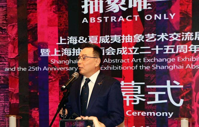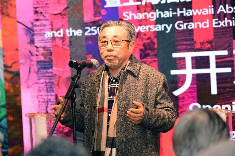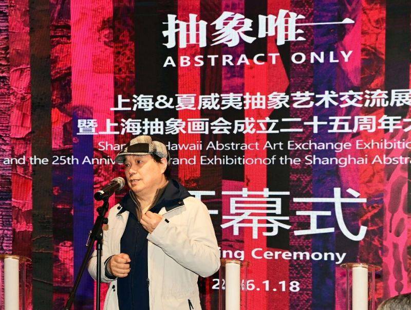 丁曦林:很高兴参加今天的盛会,首先向主办单位,上海抽象画会表示热烈祝贺,祝贺他们成立25周年,另外也祝贺上海夏威夷抽象艺术交流展圆满的举办。