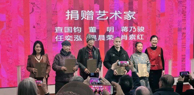 艺术家捐赠作品仪式,左起:任奕泓、查国钧、吴晨荣、董明、肖素红、居益萍