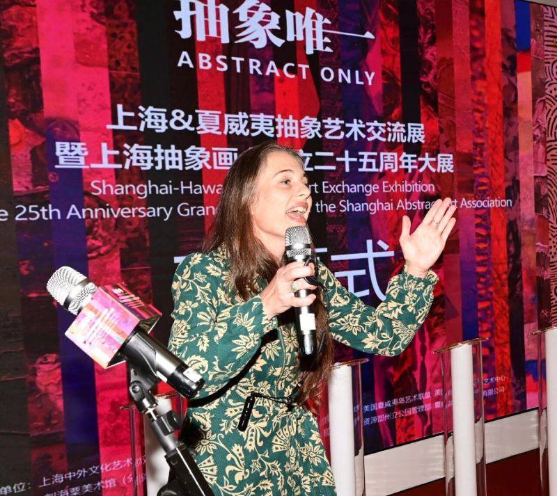跨越太平洋,从夏威夷来到上海,很高兴和上海抽象画家进行交流,感受这座具有魅力的城市和你们的热情。我带来了一些夏威夷艺术家的礼品,分别献给上海中外文化艺术交流协会、上海抽象画会、刘海粟美术馆分馆,表达我们的心意。同时我还带来了夏威夷传统的歌舞,是传说中的火山女神感怀生命与吉祥的故事,献给你们。