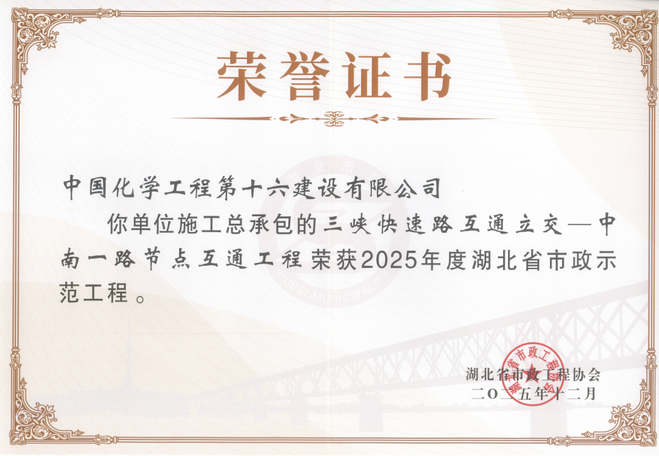 近日,由中国化学工程第十六建设有限公司施工总承包的“三峡快速路互通立交-中南一路节点互通工程”荣获2025年度“湖北省市政示范工程”称号。该奖项由湖北省市政工程协会组织评选,是湖北省市政工程领域质量、技术、管理水平的最高荣誉之一。