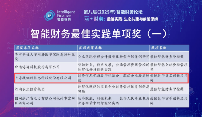 在论坛举办的重要环节——第六届中国智能财务最佳实践奖评选中,找钢网脱颖而出,荣获“最佳数字员工创新应用奖”。这一奖项由上海国家会计学院院长卢文彬、智能财务研究院院长刘勤及联席院长共同揭晓,含金量十足,标志着找钢网在财务数字化转型方面的卓越实践得到了国家级权威学术机构的高度认可。