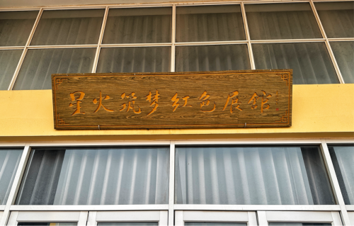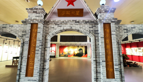 展馆内部以青砖拱门为序,两侧“传承百年红色精神,培育时代自强英才”的楹联,点明了展馆“以史育人、以文化人”的核心宗旨。拱门上方的“星火筑梦”匾额,与头顶的红星交相辉映,仿佛在诉说着革命星火从这里燃起、照亮前行之路的峥嵘岁月。