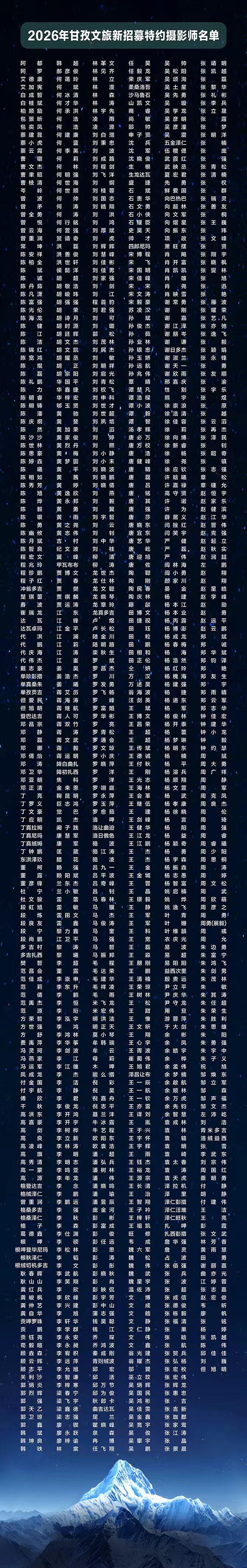 1月26日,据甘孜州文化广播电视和旅游局消息,该局于2025年12月22日面向社会公开招募的“甘孜文旅特约摄影师”评选工作圆满结束。经过严格筛选,共有1040名摄影师成功获聘,他们将持证在三年聘期(2026年—2028年)内,用镜头深度记录和传播甘孜的自然风光与人文魅力。
