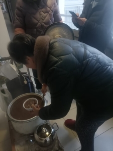 除了大家互相帮助制作宋锦包外,还有一件暖心小事也在悄然发生:腊八节前夕,恰逢南京大雪,暖心家园的服务对象兼志愿者潘大姐,考虑到大家出门购买早饭不便,特意将熬好的腊八粥与服务对象们分享,通过热气腾腾的腊八粥,传递了邻里间的温情。