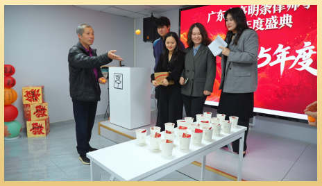 文艺表演意犹未尽,趣味十足的互动游戏环节随即点燃全场热情,让现场瞬间变成欢乐的海洋。“鱼跃龙门”乒乓球投掷游戏,巧妙呼应了律师工作中对证据的精准把控与细节追求,纸杯内的红包奖励更是点燃了大家的参与热情,杜舜夷主任率先登台示范,精准投掷的身手尽显“律政精英”的沉稳与利落。“龙盘虎踞”套圈游戏则唤醒了众人的童年记忆,大家摩拳擦掌、各展身手,每一次套中都伴随着欢呼与喝彩,红包奖品轮番送出,欢声笑语萦绕全场,在轻松惬意的互动中,同事间的情谊愈发浓厚。