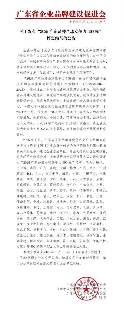 2026年1月,广东省企业品牌建设促进会广东品牌全球竞争力实验室按照《企业品牌全球竞争力评价通则》团体标准相关评价程序,通过企业自主申报、专业机构及社会组织推荐,综合运用大数据分析、实地调研与专家评审等方式,最终评定出“2025广东品牌全球竞争力500强”名单。华为、腾讯、比亚迪、华润、广药、美的、大疆、格力、广汽、中兴、广州酒家、TCL、立白、南方电网、海信、小鹏、中国平安、立讯精密、华发、富士康、OPPO、顺丰、vivo、南方航空、荣耀、招商银行、中国广核、迈瑞医疗、格兰仕、中信证券、中集、创维、金发、怡亚通、希音、传音、惠科、亿纬锂能、李锦记、爱施德、欣旺达、温氏、欧菲光、万宝、影石、联塑、广船、佛山照明、金蝶、纳思达、格林美、玖龙、大族激光、欧派、深南电路、慕思、王老吉、海天、马可波罗、长隆、步步高、粤芯半导体、贝特瑞、凤铝、大长江、华帝、先导稀材、信利光电、喜之郎、名创优品、天珑、广电运通、康冠、倍思、江波龙、高景太阳能、冠宇电池、深信服、货拉拉、大洋电机、尚品宅配、华利实业、南玻、生益、佳都、中农网、康方生物、美涂士、优合、维达纸业、漫步者、东鹏控股、快尚时装、星湖生物、丽珠医药、珠江啤酒、雷士光电、安吉尔、坚美铝材、万家乐等500家获评AAA及以上等级的企业入选。