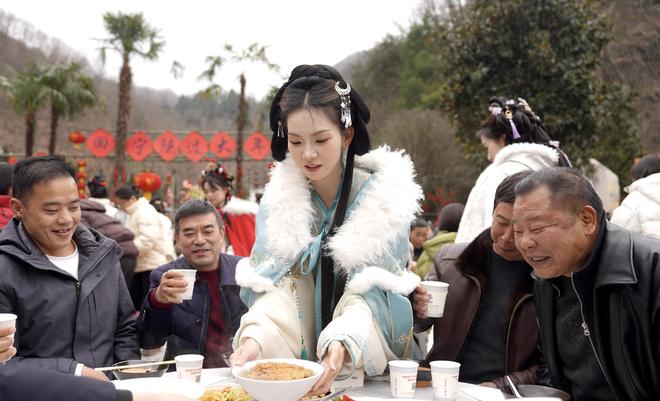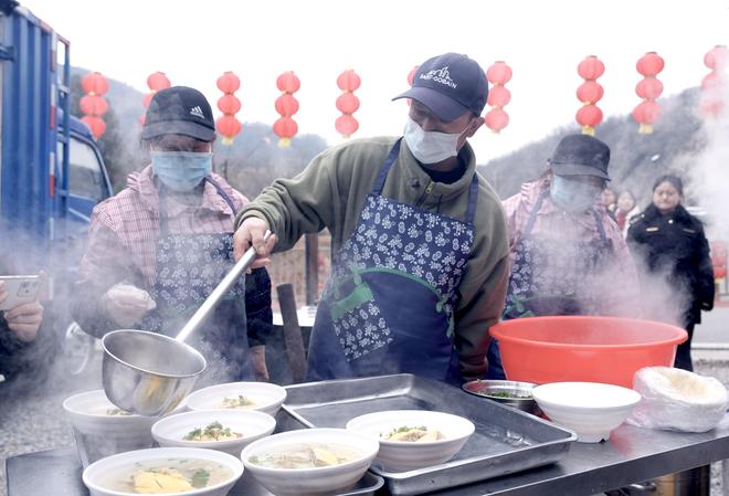 舞台旁的农家杀猪菜宴同样人气十足。传统的年猪祭礼仪式尽显民俗底蕴,刚出锅的杀猪菜鲜香四溢,40桌宴席座无虚席。游客们大碗喝汤、大块吃肉,在热气腾腾的农家蒸碗中,品味地道乡野年味,感受团圆的幸福。