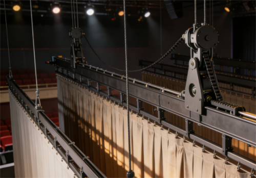 拉幕机位于舞台台口内侧上方,可采用水平对开、垂直升降等方式,实现大幕上升、对开、斜拉功能,完成演艺场景分割与空间重构。机械化流程,运行平稳,效率高。