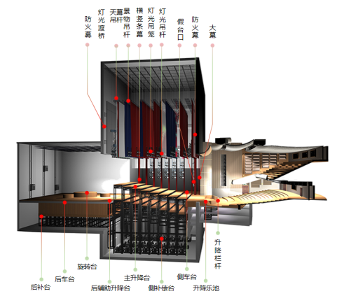 可分为台上设备、台下设备、观众席设备,包括防火设备、大幕场幕设备、布光设备、升降台类、车台类、转台类等。