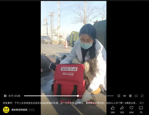 事发当天,围观群众上传这段紧急救人视频,并圈出这名“白衣天使”的车牌号,当地网友们都在接力找到这位有勇气、有医德的护士。不到一天,就有市民认出这是自己长期合作的京东健康到家护士——孙诗卉。