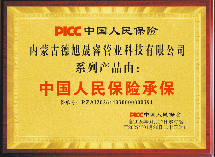 2026年1月,内蒙古德旭晟睿管业科技有限公司旗下产品已通过中国人民财产保险股份有限公司(PICC)审核,获承保产品责任险。此次合作标志着德旭晟睿管业在产品质量与消费者安全保障方面迈出坚实一步,进一步彰显其“服务领先,质量为本”的经营理念。