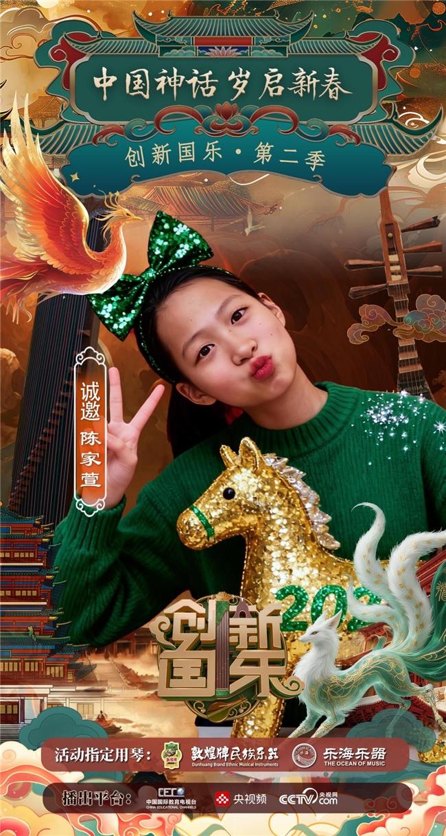 为持续推动中华优秀传统文化的创造性转化与创新性发展,打造具有时代气息的国乐精品,创新国乐第二季“中国神话 岁启新春”大型原创国乐盛典2026年2月8日在北京首钢园隆重启幕!在此,我们特别向学员陈家萱发出正式演出邀请,期待她以更加成熟的技艺与表现力,与我们共同演绎华夏神话的壮丽诗篇。