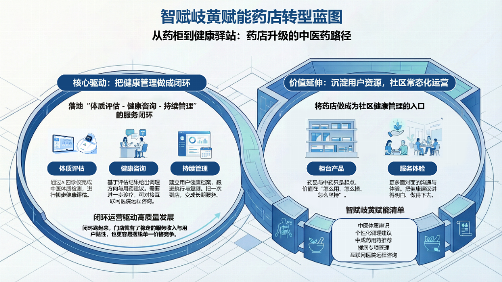 智赋岐黄就是做药店转型的那块"底座"。让健康服务可标准化、可复制、可持续,让每一家门店都更接近政策期待的样子——社区居民身边的健康驿站。