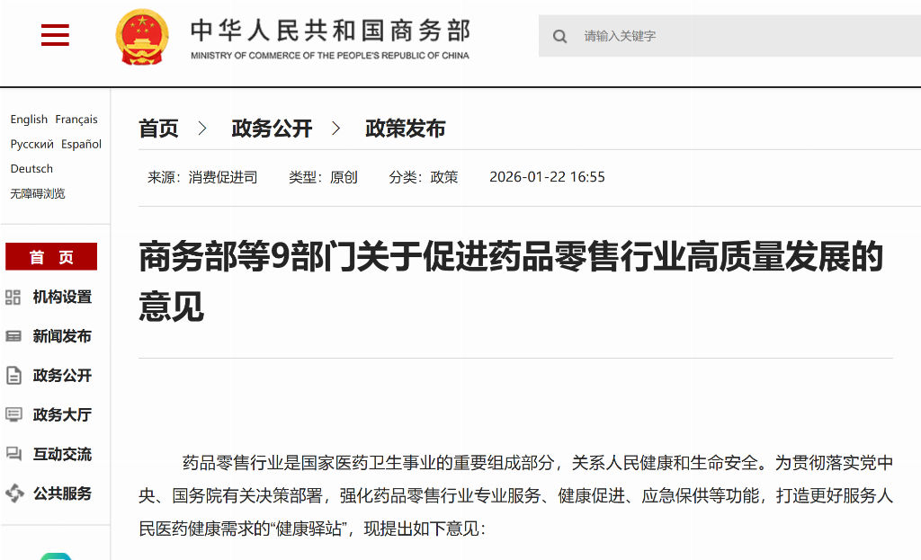 商务部等9部门发布的《关于促进药品零售行业高质量发展的意见》提出,推动依托实体医疗机构的互联网医院打造"零售药店健康咨询中心",配备远程健康咨询相关设施设备,依法依规提供便民远程健康服务,承接复诊外配处方、配药购药及后续健康服务。