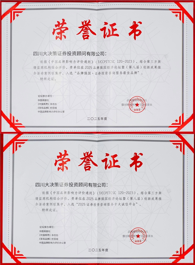 值得一提的是,四川大决策在品牌强国活动中表现亮眼,已连续三年斩获双奖。在第六届活动中,公司荣获“品牌强国·金融服务年度影响力企业”和“品牌强国·金融服务放心品牌”两项成果案例;第七届则摘得“2024年度证券行业十大创新企业”与“2024证券100强企业”的桂冠。这一系列荣誉无疑是对四川大决策深耕发展与不懈努力的高度认可与有力见证。