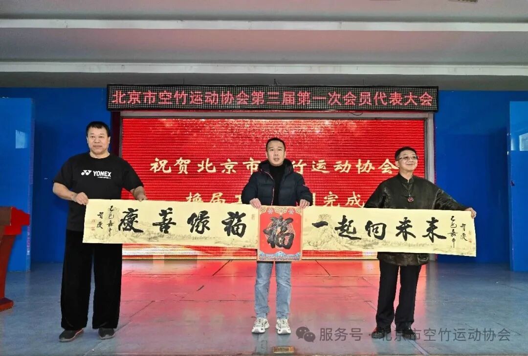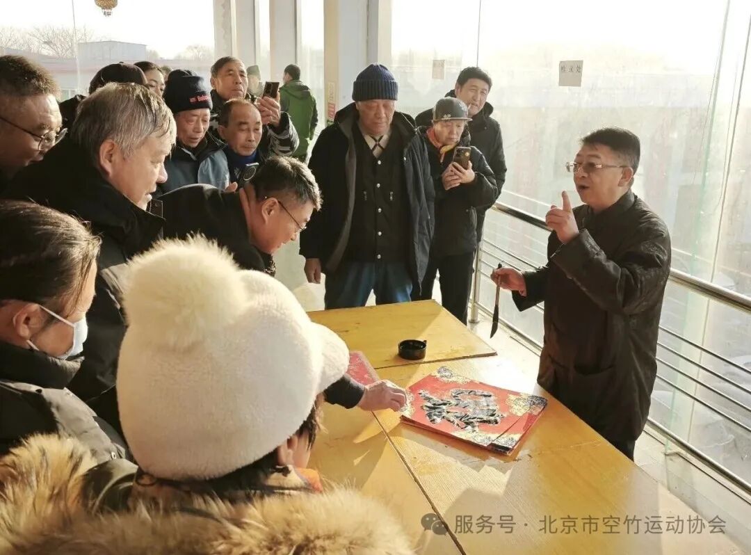 郭宝庆在讲话中表示,协会将团结带领全体会员,始终秉持 “传承创新、普及推广” 的工作理念。作为 2008 年北京奥运会 “北京欢迎你”书法作品创作者、2022 年北京冬奥会宣传大使,他明确提出三大发展方向:一是深化校园普及工作,推动空竹运动纳入更多中小学体育课程与社团活动,着力培养青少年传承力量;二是升级赛事体系建设,打造京津冀乃至全国性空竹品牌赛事,提升项目影响力;三是拓展文化融合边界,推动空竹与书法、舞蹈等艺术形式跨界创新融合,让这一古老非遗技艺在新时代焕发蓬勃新活力。会议过程中,郭宝庆与会员代表愉快交流,还现场为会代表书写了福字、空竹等书法作品,传递美好祝愿。
