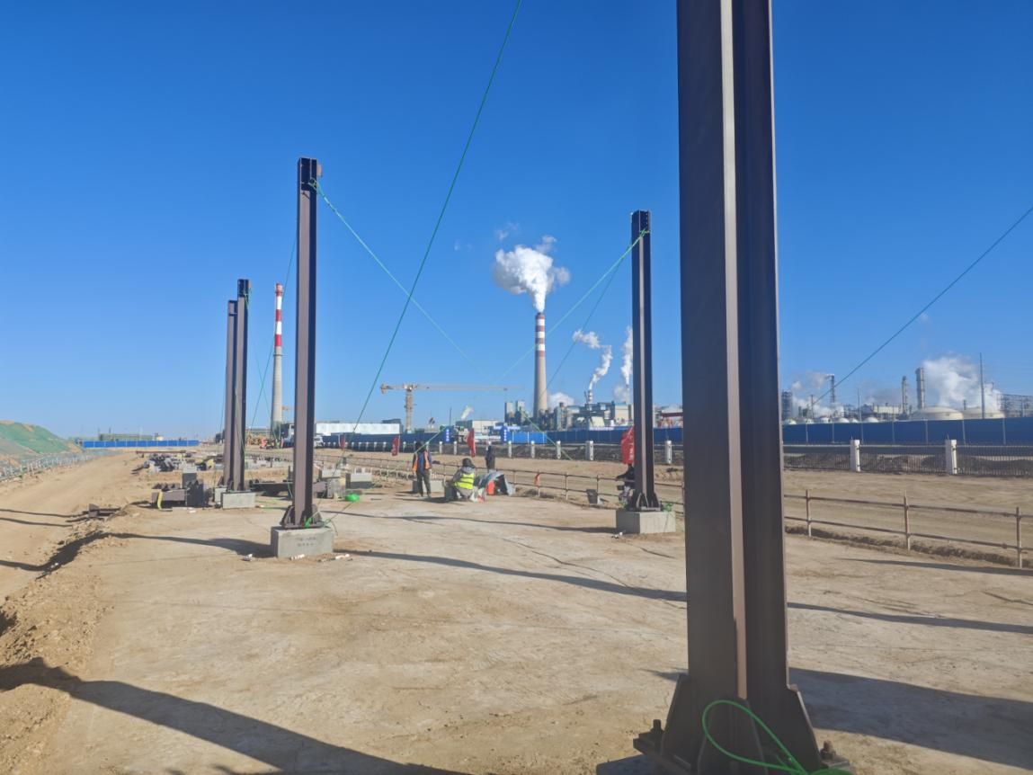 此次吊装的X4段管廊是全厂外管廊的重要组成部分。该外管廊总长670余米、宽8米,采用管廊式管架结构,具有轴线多、基础分布密集等特点,对施工组织与技术要求较高。自2025年10月中旬开工以来,西北分公司项目团队克服冬季施工困难,科学推进基础工程建设。施工过程中,团队严格遵循技术规范,依次完成测量放线、基坑开挖、地基验槽、三七灰土回填、混凝土垫层浇筑等工序。在承台施工阶段,项目部强化全过程质量控制,从钢筋绑扎、模板支设到预埋螺栓安装固定,均严格执行标准,并通过隐蔽工程验收,为后续吊装作业奠定了坚实基础。