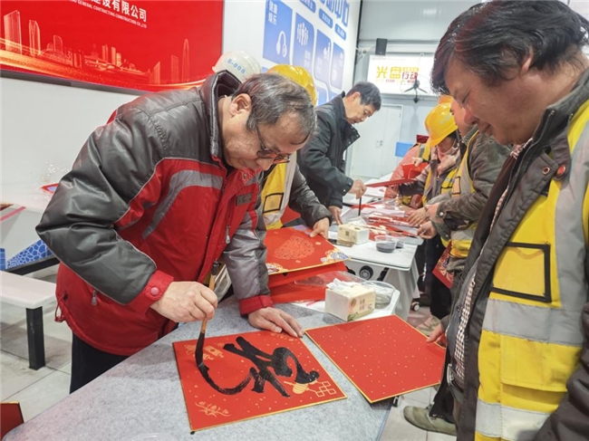 此次活动特别融入了传统文化元素。总承包公司第一分公司特邀上海市书法家协会会员、闵行区书法家协会理事斯华申,以及上海市书法家协会会员、闵行区书法家协会会员程振荣两位书法家现场挥毫。红纸铺展,墨香四溢,两位老师笔走龙蛇,一幅幅寓意吉祥的春联和一个个饱满的“福”字跃然纸上,将新春的美好祝福凝于笔端。工友们纷纷围拢,挑选自己心仪的春联和“福”字,脸上洋溢着喜悦的笑容。手写的春联不仅增添了浓厚的年味,更让工友们感受到了中华传统文化的魅力和来自社会各界的深情厚谊。