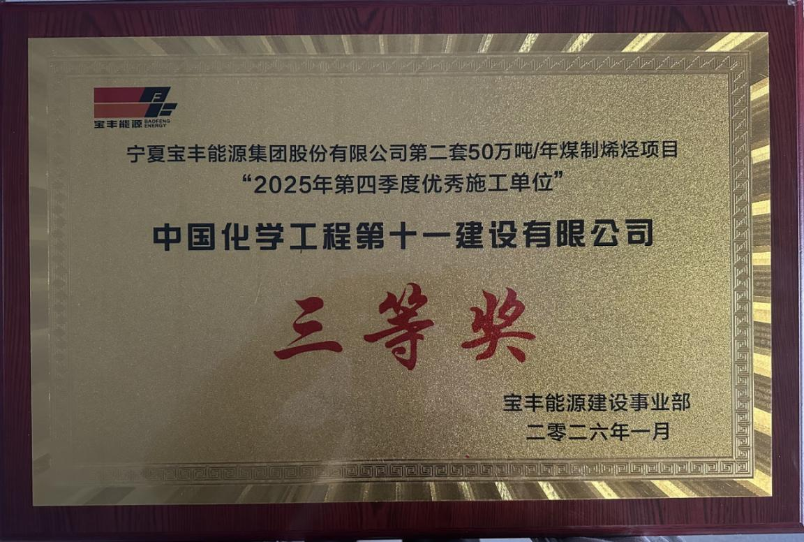 1月24日,在宁夏宝丰能源集团股份有限公司召开的2025年度工作总结暨表彰大会上,中国化学工程第十一建设有限公司荣获 “优秀施工单位三等奖”。 该荣誉主要表彰其旗下西北分公司在承建宁夏宝丰能源第二套50万吨/年煤制烯烃项目中的突出贡献。