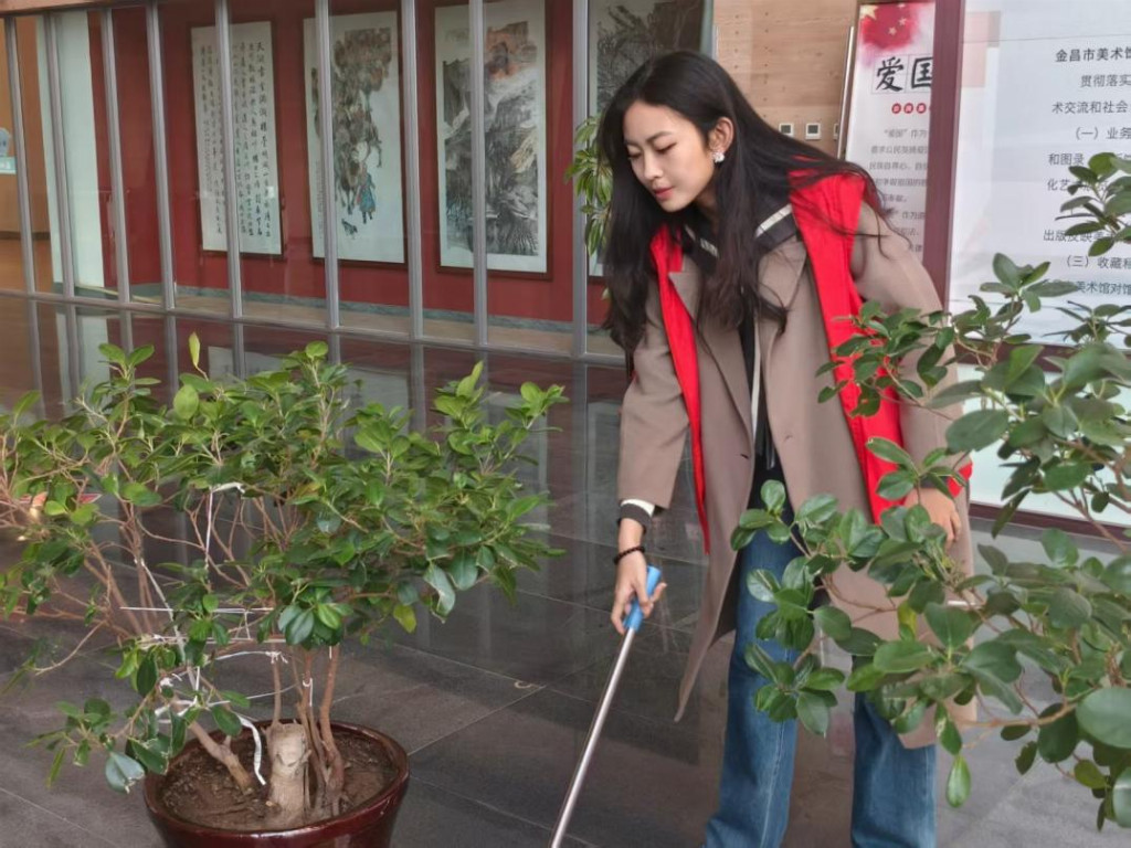 在展厅外的公共区域,实践队员手持喷壶为绿植浇水,枝叶上的水珠折射出人文温度。这份细致不仅是对公共空间的维护,更是实践队“美育浸润,始于细节”的理念体现。