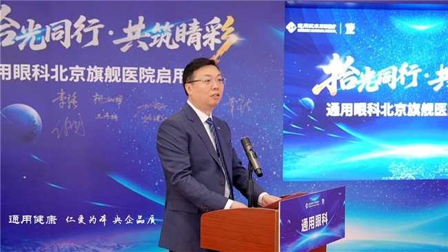 李贺代表通用眼科向长期关心和支持医院发展的各界领导表达衷心的感谢。他表示当前“健康中国2030”战略深入推进,视觉健康成为国家战略与民生关切的核心议题。此次通用眼科的启用,既是中国通用技术集团践行央企担当、回应民生眼科需求的重要举措,也是环球医疗布局医疗健康领域、助力“健康中国”建设的关键落子。医院明确提出了树立标杆定位:即成为医疗质量与安全的标杆,建立严苛的质控体系;成为技术创新与引领的标杆,紧跟并推动眼科前沿发展;成为服务体验与人文关怀的标杆,重塑温暖、尊重的医患关系;成为公益践行与社会责任的标杆,主动承担区域眼健康“守门人”职责,通过科普、义诊等形式普惠于民。未来,通用眼科将严守医疗质量安全底线,以创新驱动诊疗水平提升,以公益践行医疗使命,全力守护百姓视觉健康,朝着“百姓信赖、业界认可、政府满意的眼科诊疗中心”目标迈进,为全民健康事业发展持续贡献眼科力量。