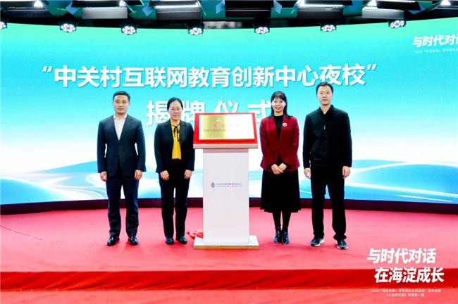 本次活动还举行了两项重要仪式,为青年成长服务体系落地夯实基础。在 “中关村互联网教育创新中心夜校”揭牌环节,中关村街道办事处副主任黄宇玲、北京海淀置业集团副总经理张晓、海淀区人才工作局人才一科科长张梓博、中关村互联网教育创新中心总经理赵伟鹏共同上台,为“中关村互联网教育创新中心夜校”揭牌。该夜校的正式落地,将打造面向海淀青年的多元化、常态化学习提升平台,围绕人工智能、数字技能、职业素养、人文素养等青年关注的领域开设课程,弥补青年碎片化时间的学习需求,构建便捷高效的终身学习场景。