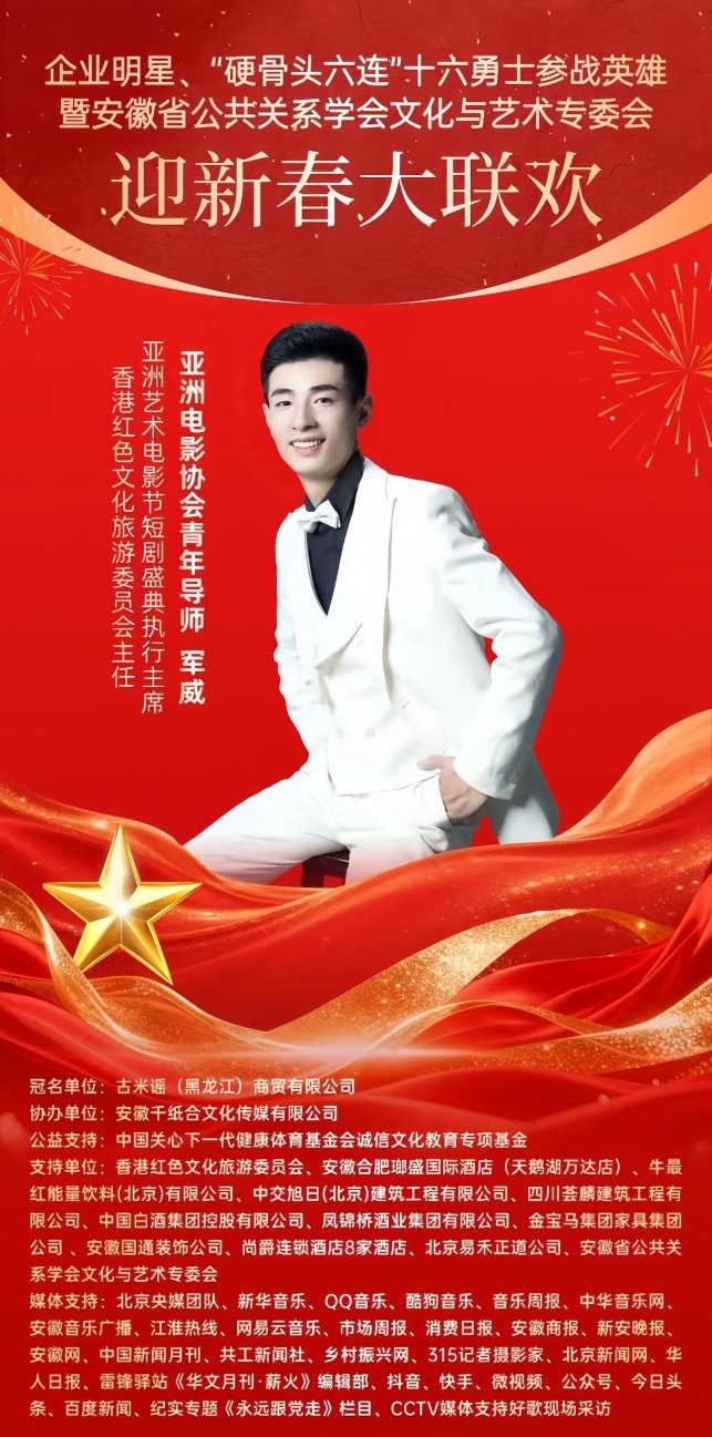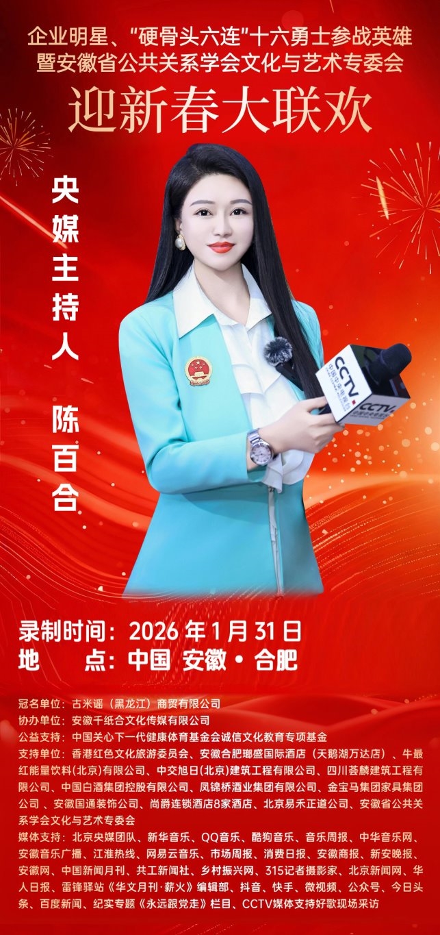 2026丙午马年新春将至,暖意渐浓。近日,备受关注的《企业明星•“硬骨头六连”十六勇士参战英雄•安徽省公共关系学会文化艺术专委会•迎新春大联欢》活动进入筹备倒计时,将在2026年1月31日于中国安徽合肥举行。