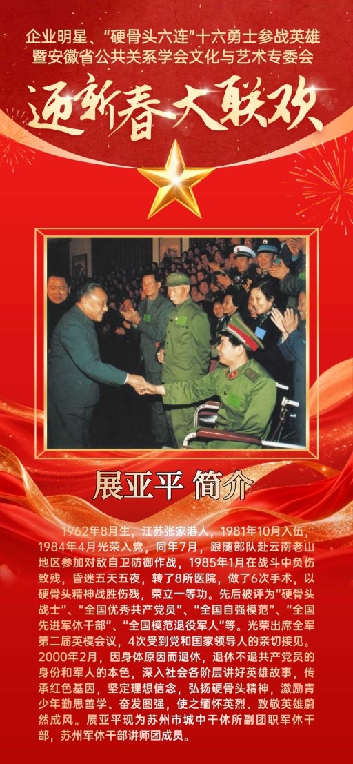 据悉,本次迎新春大联欢以“传承英雄精神、汇聚红色文化力量、共贺新春佳节”为主题,汇聚了多领域代表:既有在经济建设中勇立潮头的企业明星,展现新时代企业家与时代同频的责任担当和进取精神;也有被中宣部誉为"时代楷模"—"硬骨头六连"十六勇士参战英雄集体代表,传承人民军队的铁血荣光;更有16位参战英雄亲临现场,重温峥嵘岁月,彰显家国情怀;安徽省公共关系学会文化艺术专委会的文艺工作者们则将带来精彩演出,以红色文化歌颂形式礼赞英雄、致敬时代。