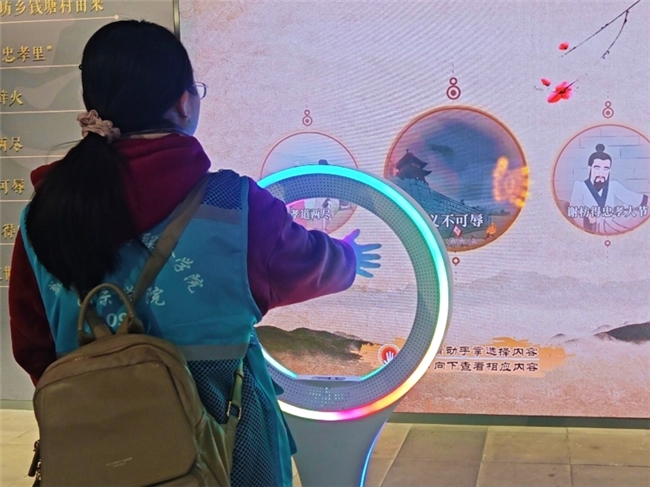 走进寒泉精舍,数字技术与传统文化的碰撞正带来沉浸式体验革新。巨型互动大屏打破了传统展陈的静态局限,以动态影像、情景动画串联起朱子著书、孝亲守礼等人生片段,配合真人配音与场景音效,将抽象的理学故事转化为直观可感的视听叙事。更具巧思的是地面与大屏的联动设计——当实践队队员脚步落在“格物”“致知”等镌刻于地板的关键词上,大屏即刻同步呈现“格物致知,诚意正心”等朱子名言及释义,文字与思想的呼应在脚步起落间完成传递。
