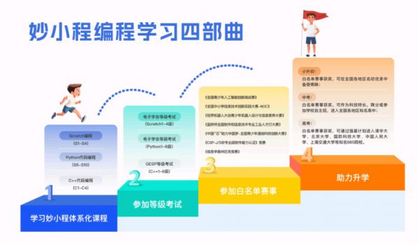 而9岁以上的孩子,随着抽象思维能力的逐渐发展,可以开始尝试代码编程课程,如Python、C++等。像小码王的课程体系,就为这个年龄段的孩子提供了从基础代码学习到算法设计的进阶路径,帮助他们深入理解编程的本质。如果孩子有参加编程竞赛的目标,那么选择竞赛导向型的机构就尤为重要,如妙小程,其课程紧密对标各类权威赛事,能为孩子提供针对性的训练和指导。