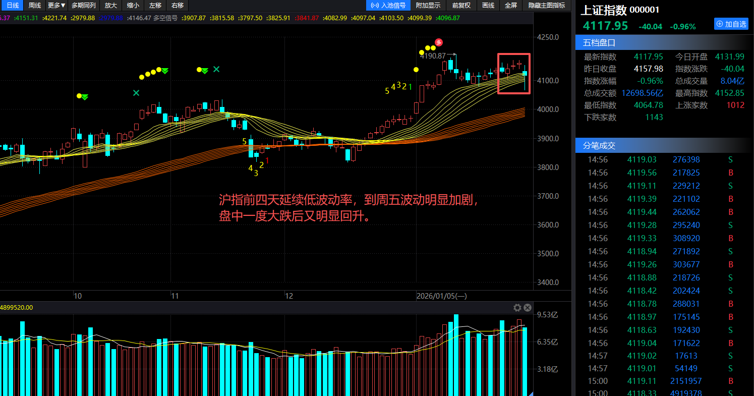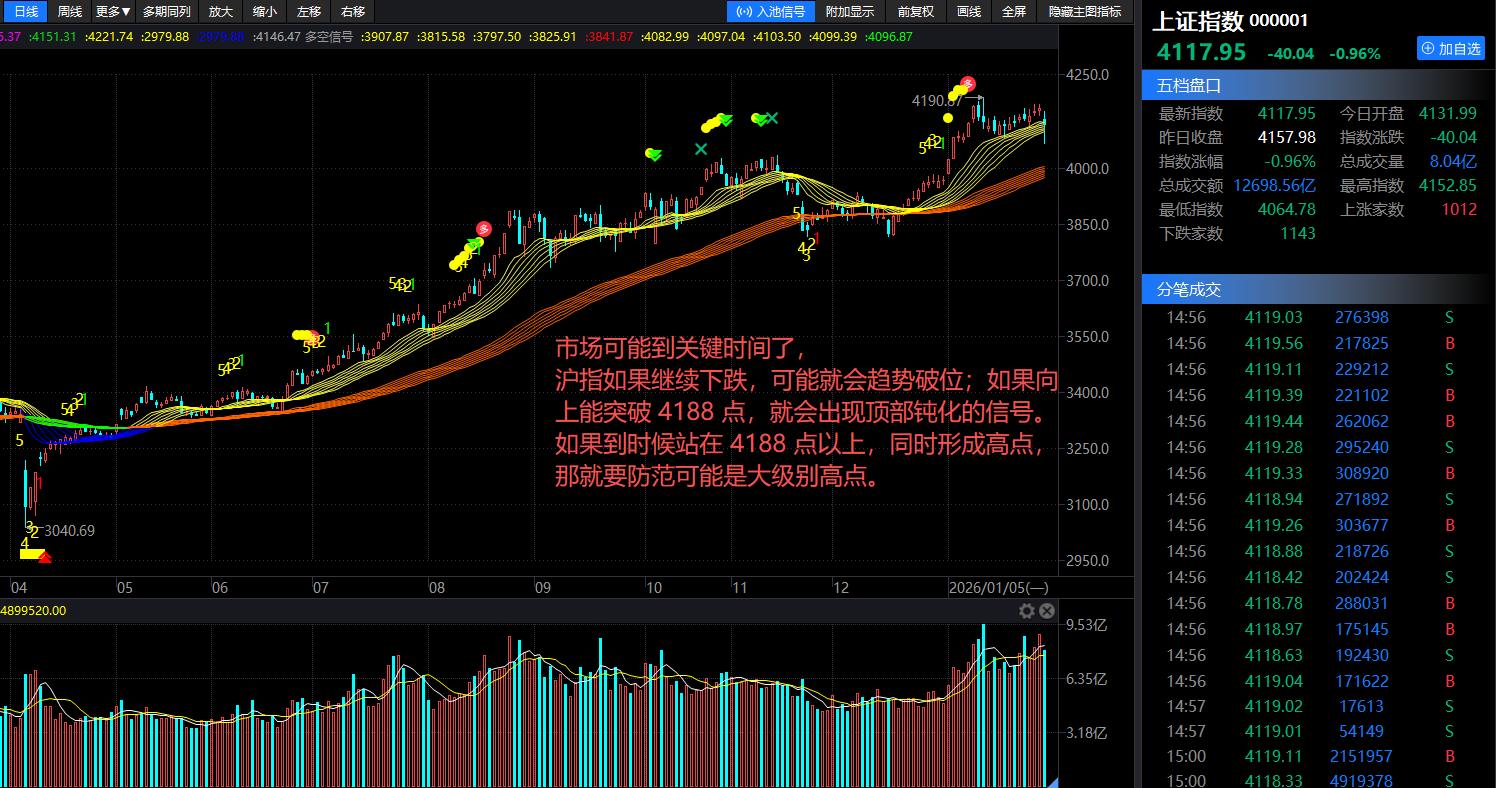 我们之前一直在说,沪指一直没有出现顶部结构,这里无法判定为确定性较大的高点,即无法判定是否有较大的调整。沪指周五回踩趋势带附近了,也就是说短期可能要考验趋势了。接下来可能就要进入到关键时间了,如果继续下跌,可能就会趋势破位;如果向上能突破 4188 点,就会出现顶部钝化的信号(顶部钝化不代表就会见顶:要是行情继续加速上涨,这个顶部钝化信号就会消失;但如果涨不动了,顶部钝化就可能演变为的顶部结构)。如果到时候站在 4188 点以上,同时形成高点,那就要防范可能是大级别高点。