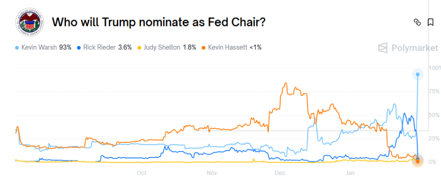 根据预测平台Polymarket的数据显示,目前沃什被特朗普提名为美联储新主席的概率飙升至93%。